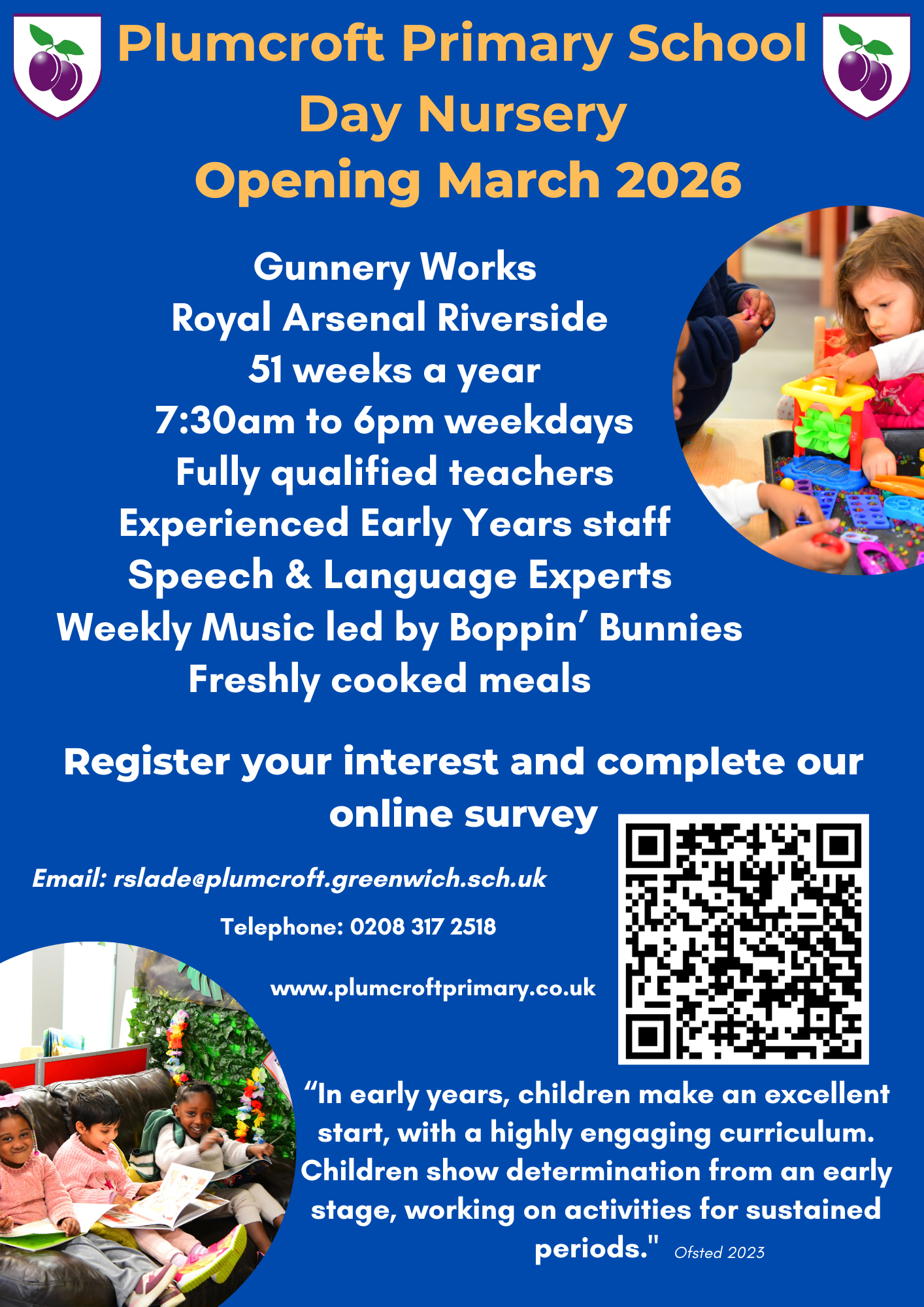 As our school community continues to grow, we will be opening a new Plumcroft Day Nursery in March 2026.
